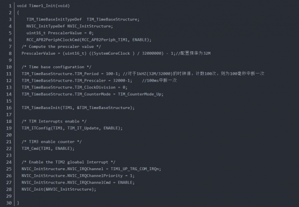 定時(shí)器選用TIM1和TIM2,使用基本定時(shí)器功能時(shí),方法和stm32的類似。TIM_Period為計(jì)數(shù)周期(次數(shù)),TIM_Prescaler為時(shí)鐘源的分頻數(shù)。如果時(shí)鐘源為32M,分頻數(shù)為32000-1,那么給定時(shí)器提供的時(shí)鐘為:32M/32000=1000Hz(1ms)。 如果計(jì)數(shù)100次,也就是100ms。