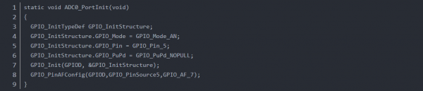 如將SWDIO復(fù)用成AD0,要是用AF,作為多功能選擇。不需要配置IOMUX寄存器, 代碼如下
