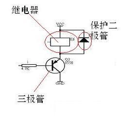 圖上還有一個東西,是保護(hù)二極管,如果不需要深入理解的話,你大可不必追就為什么有它存在,但是一定得記住,只要是用三極管驅(qū)動繼電器的場合,一般都有它的存在.需要特別注意的是它的接法:并聯(lián)在繼電器兩端 陰極一定是接Vcc