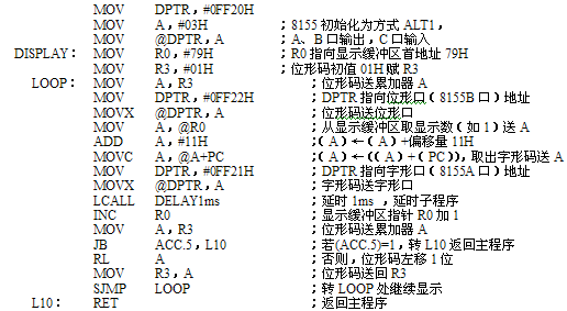 將要顯示的6個數(shù)存放在顯示緩沖區(qū)79H~7EH單元中,將0~F這16個數(shù)的字形碼存放在首地址為CODE的程序存儲區(qū)。從顯示緩沖區(qū)取出要顯示數(shù)送入累加器A,通過變址尋址指令MOVC A,@A+PC將顯示數(shù)轉(zhuǎn)換成對應(yīng)的字形碼。再將字形碼由A送入字形口PA,位形碼送入位選口PB,即可顯示緩沖區(qū)中對應(yīng)的數(shù)字。采用動態(tài)掃描法,則可將79H~7EH中6個數(shù)在6個八段管DG0~DG5上顯示出來。