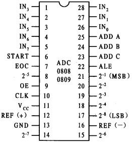 ADC0809 是 8 位 A/D 轉換器。分辨率 8 位,帶 8 個模擬量輸入通道,有通道地址譯碼鎖存器,輸出帶三態數據鎖存器。