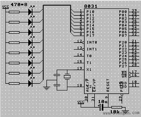 2、振蕩電路:單片機是一種時序電路,必須供給脈沖信號才能正常工作,在單片機內部已集成了振蕩器,使用晶體振蕩器,接18、19腳。只要買來晶體振蕩器,電容,連上就能了,按圖1接上即可。