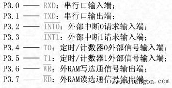 80C51共有4個8位并行I/O端口:P0、P1、P2、P3口,共32個引腳。P3口還具有第二功能,用于特殊信號輸入輸出和控制信號(屬控制總線)。