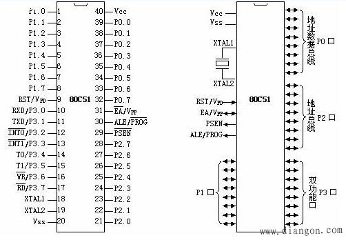 80C51單片機屬于MCS-51系列單片機,采用40引腳雙列直插式DIP(Dual In Line Package),內有128個RAM單元及4K的ROM。