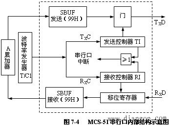 串行發送時,通過"MOV SBUF,A”寫指令,CPU把累加器A的內容寫入發送的SBUF(99H),再由TxD引腳一位一位地向外發送;串行接收時,接收端從RxD一位一位地接收數據,直到收到一個完整的字符數據后通知CPU,再通過"MOV A,SBUF"讀指令,CPU從接收的SBUF(99H)讀出數據,送到累加器A中。發送和接收的過程可以采用中斷方式,從而可以大大提高CPU的效率。