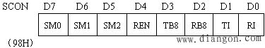 SCON是MCS-51的一個可位尋址的SFR,串行數據通信的方式選擇、接收和發送控制以及串行口的狀態標志均由專用寄存器SCON控制和指示。復位時所有位被清0。SCON的格式如下:
