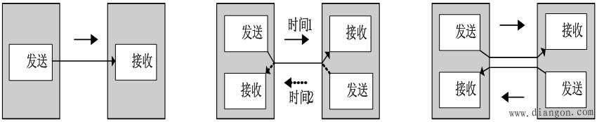 串行通訊中包含三種制式:單工方式、半雙工方式、全雙工方式。這三種制式可以通過圖5來觀察。其中著重注意全雙工方式,即雙向數據通訊方式。