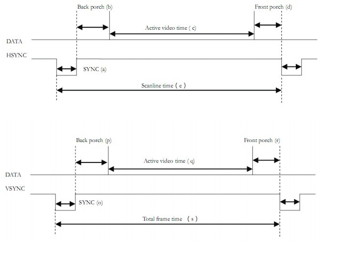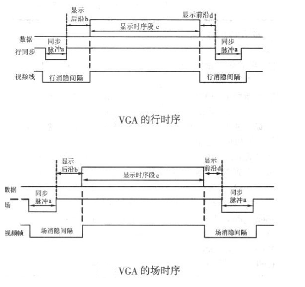 VESA中定義行時序和場時序都需要同步脈沖(Sync a)、顯示后沿(Back porch b)、顯示時序段(Display interval c)和顯示前沿(Front porch d)四部分。VGA工業標準顯示模式要求:行同步,場同步都為負極性,即同步脈沖要求是負脈沖。