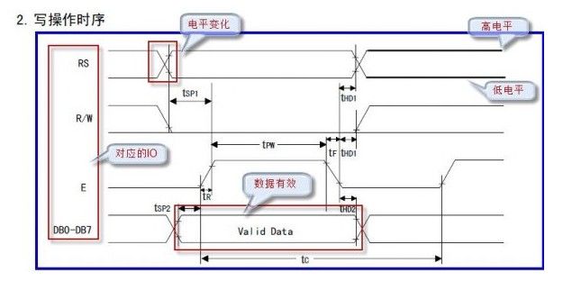 (1).時序圖最左邊一般是某一根引腳的標識,表示此行圖線體現該引腳的變化,上圖分別標明了RS、R/W、E、DB0~DB7四類引腳的時序變化。