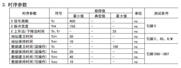 也許你還注意到了上面有許多關于時間的標注,這也是個十分重要的信息,這些時間的標注表明了某些狀態所要維持的最短或最長時間。因為器件的工作速度也是有限的,一般都跟不上主控芯片的速度,所以它們直接之間要有時序配合。話說現在各種處理器的主頻也是瘋狂增長,日后搞不好出現個雙核單片機也不一定就是夢話。下面是時序參數表: