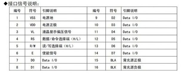 我們首先來看1602的引腳定義,1602的引腳是很整齊的SIP單列直插封裝,所以器件手冊只給出了引腳的功能數據表:
