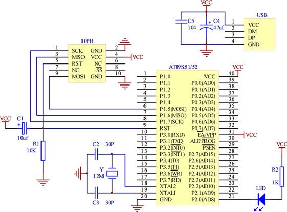 程序下載電路:10PH是AtmelISP并口下載線10P接頭。如果您還沒有AtmelISP并口下載線的話,可按照筆者提供的原理圖DIY。如果嫌麻煩,可到筆者的網店購買。