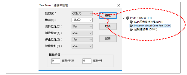 使用 Tera Term 終端軟件,操作 AliOS Things 的命令行功能。串口的配置如圖所示。(注意:Nuvoton Virtual Com Port 對(duì)應(yīng)的串口編號(hào)可在設(shè)備管理器內(nèi)找到。例如: 串口編號(hào)為 COM30。)