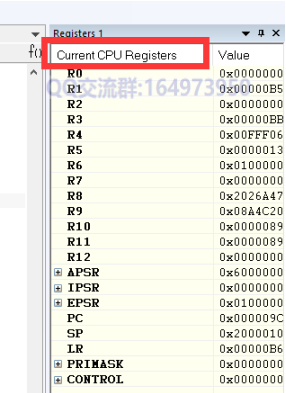 在界面的右側會看到打開的Register x的觀察窗口。在窗口中只有Current CPU Registers,下面只列出了通用的寄存器,沒有我們想要的外設的特殊功能寄存器,在Current CPU Registers上單擊鼠標右鍵。