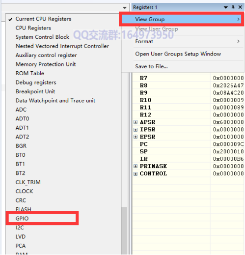 單擊右鍵后會看到View Group,把鼠標移動到View Group上會看到彈出的外設特殊功能寄存器選項,選中GPIO,如下圖: