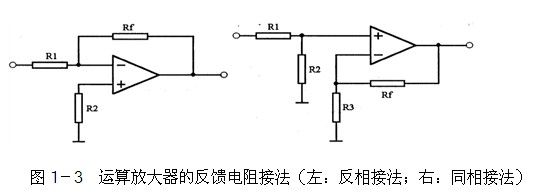 其次,由于放大倍數(shù)為無窮大,所以不能將運算放大器直接用來做放大器用,必須要將輸出的信號反饋到反相輸入端(稱為負反饋)來降低它的放大倍數(shù)。如圖1-3中左圖所示,R1的作用就是將輸出的信號返回到運算放大器的反相輸入端,由于反相輸入端與輸出的電壓是相反的,所以會減小電路的放大倍數(shù),是一個負反饋電路,電阻Rf也叫做負反饋電阻。