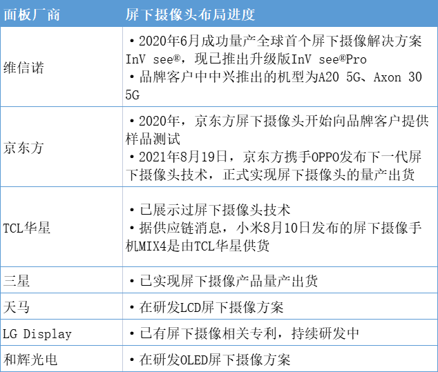 從技術成熟度方面看,目前真正實現屏下攝像方案量產出貨的面板廠商僅維信諾、京東方、TCL華星和三星,在研發的還有天馬、和輝光電、LG Display,整體出貨量不高,也還有技術工藝方面的問題需要攻克。