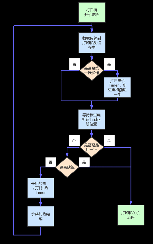 4)判斷是否是最后一行或者是否缺紙,如果是進入打印機關機流程;