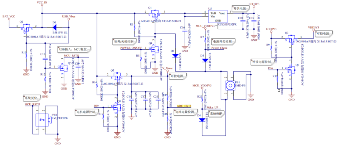 7)沒有打印任務時,需要關閉電機電源和外設電源,來節省鋰電池電量;所以系統經過定時進入待機前,MCU關閉電機驅動電源/外設電源后,進入待機。