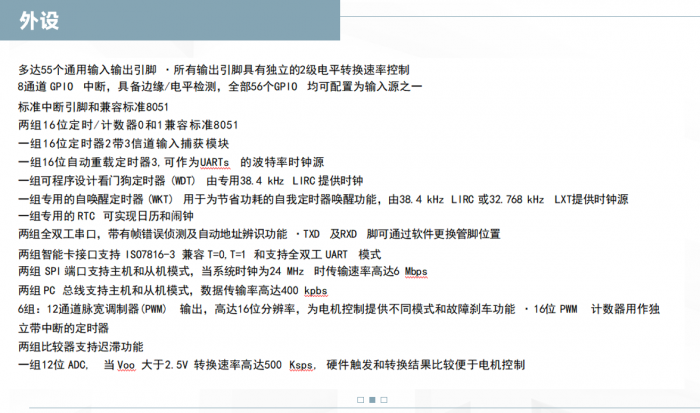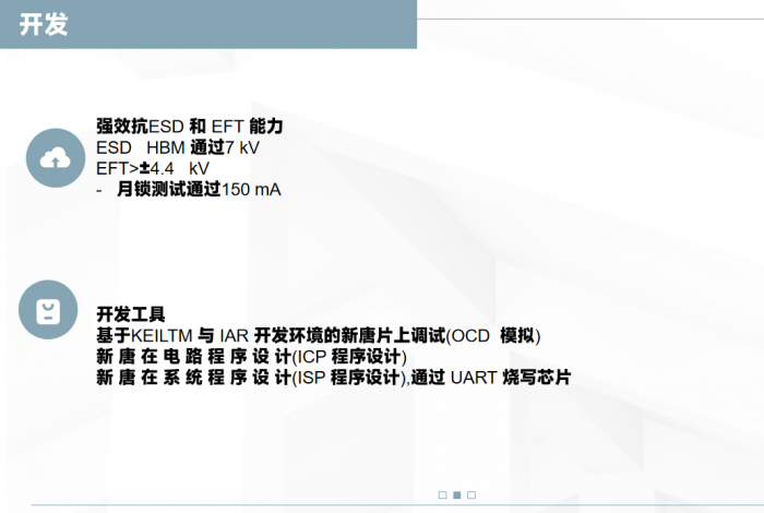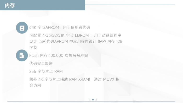 幫助客戶在開機時與周期性的實現 Flash 自我檢測功能;并內建高達 4 組 PDMA 加速數據的傳輸以減輕 CPU 負擔,針對燈光控制的應用更可以配合 SPI 或 UART 接口實現連續位之間的不間斷傳輸。