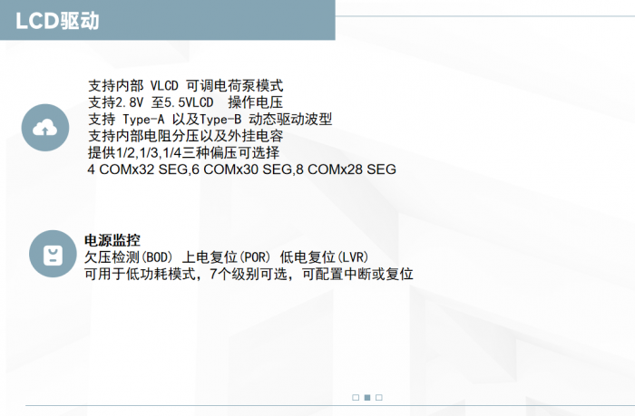 支持 Type-A 以及 Type-B動態驅動波型,最高可驅動多達 224 個點,VLCD 具備外部電壓與內部電荷泵兩種輸入模式,內部電荷泵可確保電池電壓掉電情況下MCU 仍能使 LCD 對比度保持一致。ML54 系列具備外掛電容以及內部電阻分壓兩種驅動 LCD 方式,外掛電容方式具備高達 200 mA 驅動能力用以驅動大尺寸屏幕;內部電阻分壓適用于驅動小尺寸屏幕并達到省電的功效。