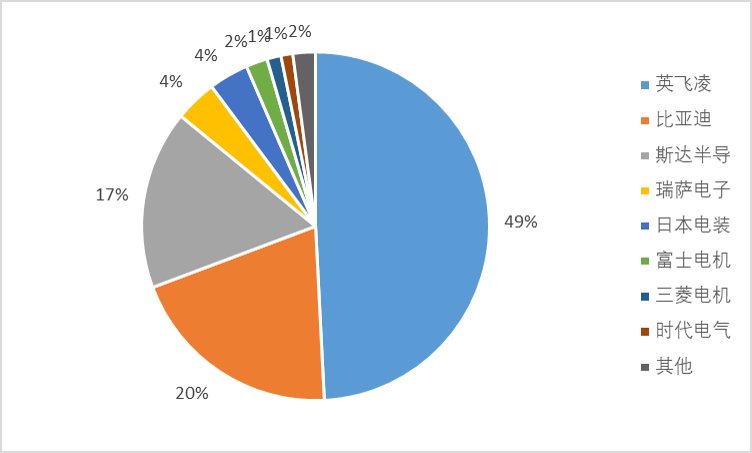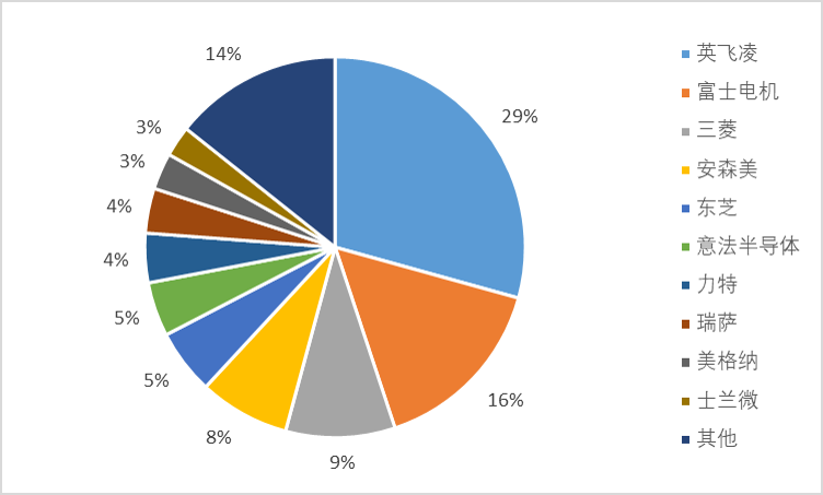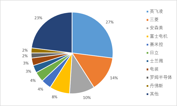 從全球 IGBT 競爭格局來看,行業(yè)較為集中, 根據(jù) Yole, 2020 年行業(yè) CR3達(dá) 50%,英飛凌是行業(yè)絕對龍頭、市占率達(dá) 27%。