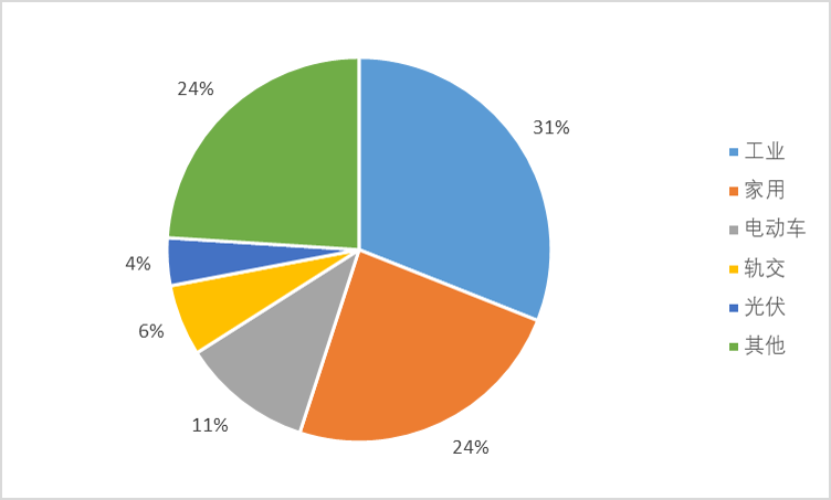 根據(jù) Yole 數(shù)據(jù), 2020 年工業(yè)、家用、電動(dòng)車、軌交、光伏、其他行業(yè)市場規(guī)模占比為 31%、 24%、 9%、 6%、 4%。
