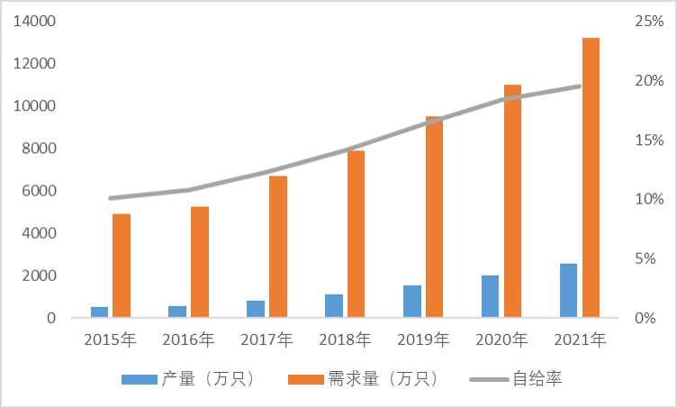 根據(jù) Yole,從產(chǎn)量來看, 2015 年國內(nèi)自給率為 10%、 2021 年國內(nèi)自給率僅19%, 行業(yè)自給率緩慢提升?紤]海外產(chǎn)品規(guī)格更高、預(yù)計(jì)從市場規(guī)模口徑來看國產(chǎn)化率更低。