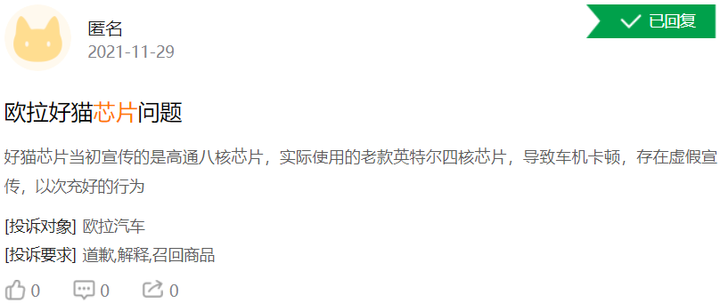 就消費者而言,筆者瀏覽黑貓投訴網站發現,搜索“假芯片”目前已有500多條投訴,其中最近引發集體投訴的長城汽車旗下歐拉好貓“換芯門”(宣傳使用的是高通8核芯片,實際為因特爾4核芯片),其實也類似于假芯片中的以次充好,當然更多是涉及了虛假宣傳。