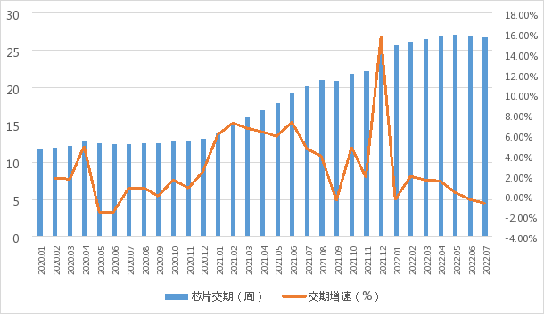 7月,全球芯片交貨周期持續緩解,自6月以來連續兩個月下降,反映出當前全球芯片供應鏈壓力不斷緩解。