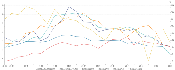 7月,全球制造業PMI指數持續回落,高通脹、地緣沖突和疫情反復持續是全球經濟復蘇穩定性趨弱的主要因素。分區域看,包括美國、歐元區、日本、英國及中國等國家/區域制造業PMI均持續走低,全球性經濟滯脹風險正在逐步加大。