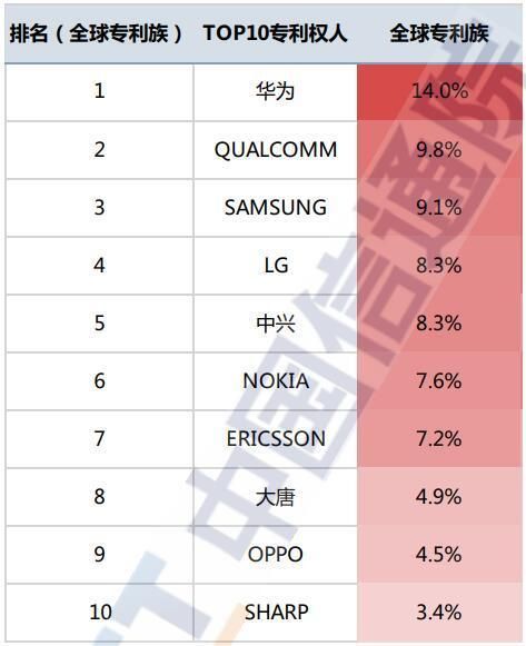 其中,華為有效全球?qū)@鍞?shù)量占比為14%,以較大的優(yōu)勢排名第一位;高通排在第二位,其占比為 9.8%;三星排在第三位,占比為 9.1%;排名第四至第十位的企業(yè)依次是 LG、中興、諾基亞、愛立信、大唐、OPPO和夏普。值得注意的是,全球各國家/地區(qū)的運營商普遍較少出現(xiàn)在5G專利聲明活動行列,但這并不代表運營商不持有5G標(biāo)準(zhǔn)必要專利。