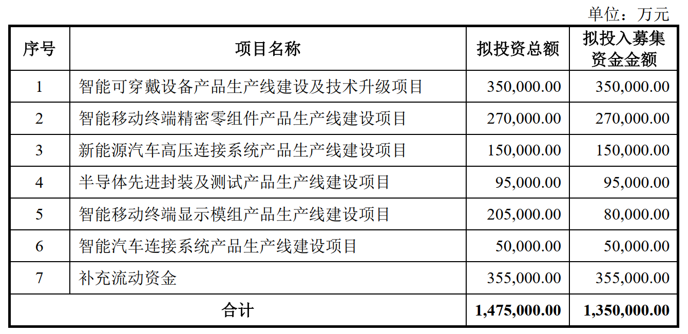 僅僅10天后的2月21日晚間,立訊精密的第二個大動作來了:一份規模高達135億元的再融資計劃,涉及可穿戴設備、移動終端、半導體封測、顯示模組等六個方面。
