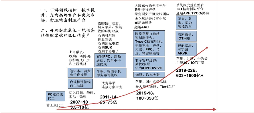 立訊精密在2010-2011年連續收購江西博碩、聯滔電子成功切入蘋果、聯想、華碩、微軟等國際知名品牌商供應鏈,其中蘋果是主攻對象,并在2014年逐漸成長為蘋果連接方案主力供應商,2015年切入手表無線充電領域。