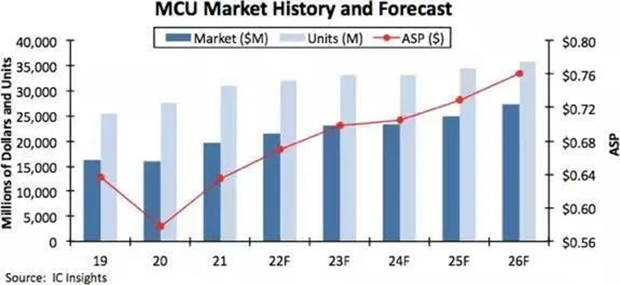 新冠疫情以來,全球持續(xù)缺芯,到現(xiàn)在依然還沒有得到實質的緩解。缺芯不僅拉長了交貨周期,而且還導致相應產品的價格上漲。在行業(yè)景氣度如此之高的情況下,MCU的銷售額也是實現(xiàn)大幅增長。據IC Insights統(tǒng)計,2021年全球MCU銷售額同比增長23%,至創(chuàng)紀錄的196億美元。IC Insights預測,未來五年32位MCU的銷售額預計將以9.4%的復合年增長率增長,到2026年將達到285億美元。