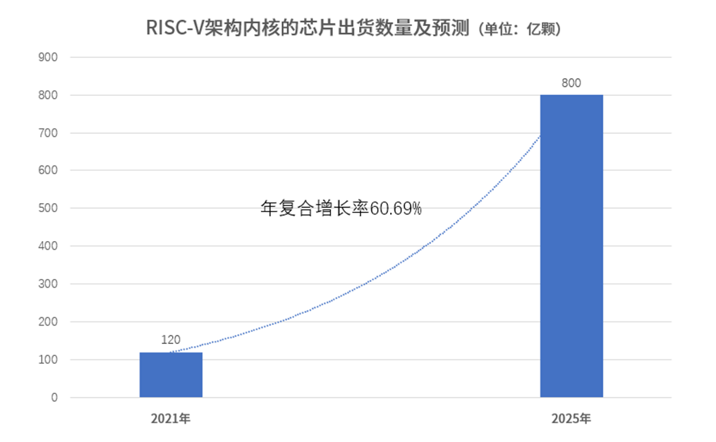 出貨量方面,據 RISC-V International的首席執行官Calista Redmond透露,2021年基于RISC-V架構內核的芯片出貨數量已達到120億顆,預計未來4年將維持60.69%的年復合增長率,到2025年出貨量將達到800億顆。事實上,達到100億的里程碑并不是件容易的事,要知道如日中天的Arm經過了17年才達到這個成就,而RISC-V架構僅用了12年就實現了。