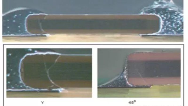 彎曲裂紋的標(biāo)志是表現(xiàn)為一個(gè)“Y”形的裂紋或是45o角斜裂紋,在DPA切面下可觀測(cè)到(見圖2)。這類裂紋有可能在MLCC的外表面觀測(cè)到,亦可能在外表面觀測(cè)不到。彎曲裂紋主要位于靠近PCB焊點(diǎn)處。