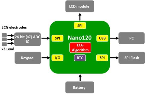 心電儀是一種醫療監測儀,使用在心律跳動不規則患者,分析心律跳動規律和提早確認心律跳動不規則,可預防心悸、心跳停止、休克。它必須包括一個超低功耗微控制器(MCU)、LCD顯示器、實時時鐘、數據保存、高精度24位ADC模擬數字轉換器、和執行ECG演算法,將數據轉換成心電圖波形,實時顯示在LCD顯示器上、并且提供通用串行總線(USB)功能將數據上傳到計算機、平板、智能手機。由于需要工作在非常低的功耗和長待機時間與電池供電,Nano120系列是適用應用于心電儀。