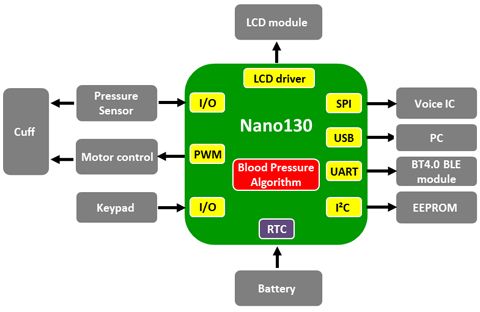 血壓儀是一種醫療監測儀,使用在高血壓患者。用于測量高血壓患者自己的血壓數據值,提醒高血壓患者注意日常飲食習。它必須包括一個超低功耗微控制器(MCU)并執行一個算法來計算血壓數據值、提供大LCD顯示器、語音提示、實時時鐘、數據保存、提供數據上傳功能到計算機、平板、智能手機。使用 USB或 低功耗藍芽BLE 4.0無線通信搭配App應用軟件。抗干擾能力強和最優可靠性。由于需要工作在非常低的功耗和長待機時間與電池供電,Nano130系列適用于血壓儀。