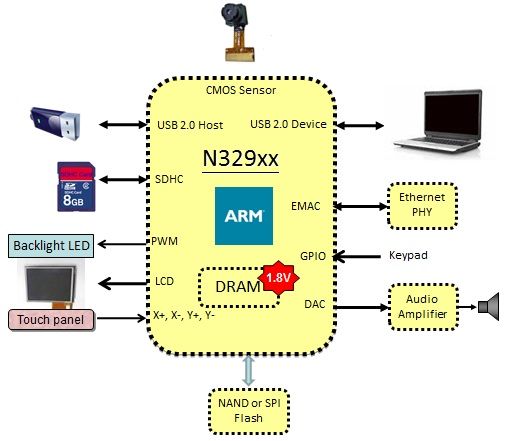 新唐科技N329系列主要特色為具有高性能和低成本32位ARM®的ARM9EJ-S內核,可以有200MHz ~ 300MHz的速度,并且有支持網絡接口, 高速的USB接口, 雙CMOS攝像頭和TFT LCD顯示設備。更重要一點是N329系列有堆棧8M Byte 到64 M bytes DDR 內存空間,不但方便客戶做2層板到4層板的電路板,更可以很容易讓客戶通過EMI和EMC的認證。N329系列基本上是將人臉辨識的功能集成在一個IC中,不但可以節省成本更可以用比較小的PCB來完成產品。基于上述特性,在人臉辨識的應用中N329 系列是一個非常高性價比的方案。