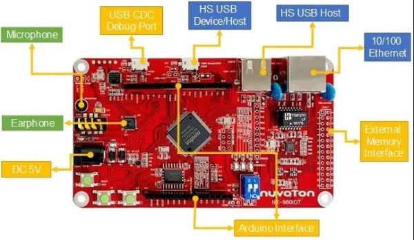 新唐NUC980系列MPU是執行速度為300 MHz的ARM9核心且最高可內嵌 128 MB DRAM。NuMaker-IIoT-NUC980開發板內嵌NUC980核心有豐富的周邊,包含單一 10/ 100 以太網口、2 個高速 USB 主機、1 Gb SPI NAND Flash 存儲裝置、麥克風輸入、立體聲耳機輸出與 Arduino 兼容接口,現可默認搭載RT-Thread。
