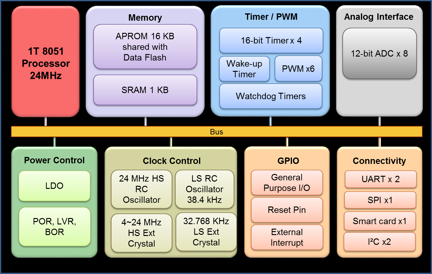 ML51UB9AE 包含 16 K 字節的 Flash 以及一個額外 1 K 字節片上輔助 RAM(XRAM), 備有豐富的外設,如 24 個通用 I/O、2 組串口、1 組 ISO-7816 界面、2 組 I2C 與 1 組 SPI,并提供 SOP28 封裝。