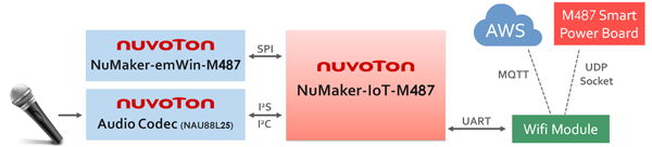本方案采用 NuMaker-IoT-M487 平臺,基于深度學習技術與關鍵詞識別 (KeyWord Spotting) 方法進行語音識別,識別結果可做為智慧電源管理器開關控制。