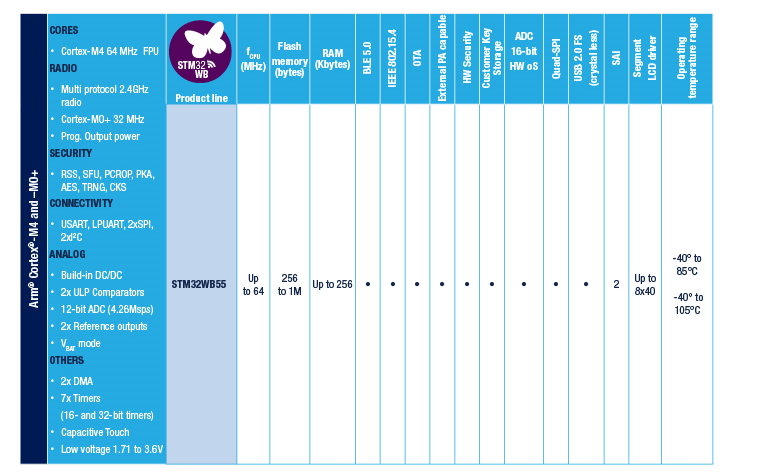 STM32WB 平臺是在市場領先的知名超低功耗STM32L4系列 MCU 的基礎上發展而來。它提供同樣的數字與模擬外設,適合需要更長電池使用壽命和復雜功能的應用。