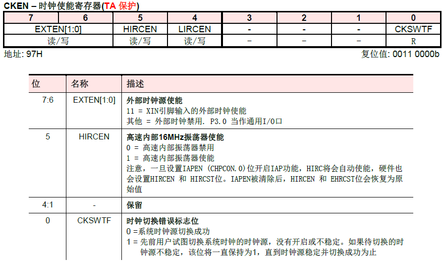 用戶首先要通過配置CKEN寄存器打開目標時鐘源#define set_HIRCEN BIT_TMP=EA;EA=0;TA=0xAA;TA=0x55;CKEN|=SET_BIT5;EA=BIT_TMP;