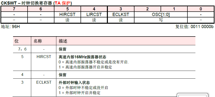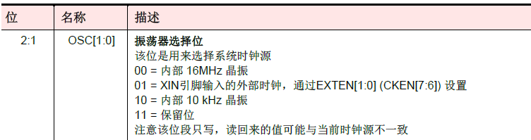 2.如果用戶試圖改變OSC[1:0]的值來切換系統時鐘,而待切換新時鐘源未被打開,OSC[1:0]值將會被立即更新,但是系統時鐘保持不變,CKSWTF (CLKEN.0)會被硬件置位。