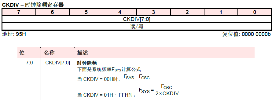 振蕩頻率(FOSC)通過配置除頻寄存器CKDIV,整數倍(最大到1/510)除頻后,再供給系統作為系統時鐘(FSYS)。這一特征可以臨時讓MCU跑在很低的速度下來降低功耗。通過時鐘除頻,可以讓MCU在正常工作模式下,很低的速度運行,確保其及時能夠響應中斷事件(比如空閑模式只能通過中斷事件退出)。這有可能比空閑模式還要省電。這樣,可以避免掉電模式情況下,需要等待振蕩器重新起振的時間。CKDIV的值可以在任何時間被程序改變,除了不能在中斷服務程序里改變。