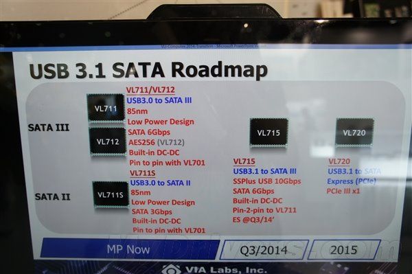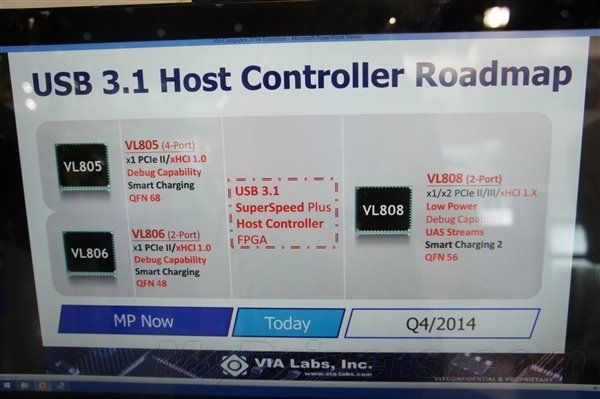威盛旗下的VIA Labs也展示了自己的USB 3.1路線圖,包括主控制器VL808,SATA設(shè)備控制器VL715、VL720。