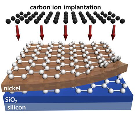 Kim的方法基于離子注入技術(shù)--一種和微電子器件相兼容的技術(shù),通常用來給半導(dǎo)體材料中摻入雜質(zhì)。在離子注入過程中,碳離子被電場加速,在500攝氏度的溫度下轟擊鍍有鎳層和氧化硅層的硅襯底。鎳層,因其高的碳溶解度,被用來作為合成石墨烯的催化劑。隨后,整個樣品經(jīng)過高溫激活退火處理(約600到900攝氏度)使碳原子之間形成蜂窩狀晶格結(jié)構(gòu),也就是石墨烯的特征微觀結(jié)構(gòu)。
