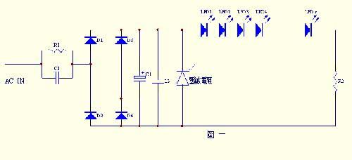 圖一為一個實際的采用電容降壓的LED驅動電路﹕請注意﹐大部分應用電路中沒有連接壓敏電阻或瞬變電壓抑制晶體管﹐建議連接上﹐因壓敏電阻或瞬變電壓抑制晶體管能在電壓突變瞬間( 如雷電﹑大用電設備起動等 )有效地將突變電流泄放﹐從而保護二級關和其它晶體管﹐它們的響應時間一般在微毫秒級 。